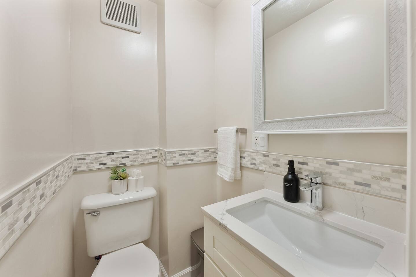 The 1.5 bathrooms are shared with up to 3 other guests. Shared Bathroom Features: - Brand Shampoo & body wash - Liquid hand soap - Hair dryer (air blower)